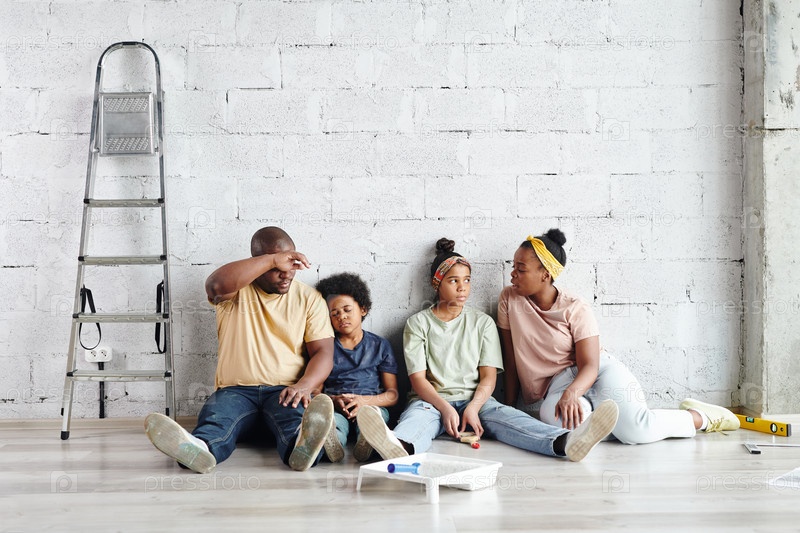 Уставшая африканская семья сидит против стены на полу гостиной после ремонта дома