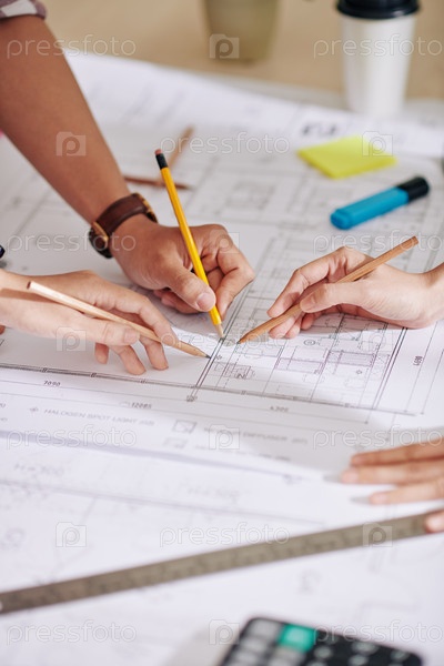 Строительные инженеры обсуждают строительный план