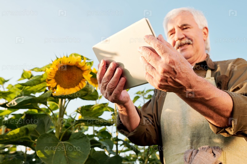 Современный старший фермер-мужчина в фартуке и рубашке делает заметки среди подсолнечника