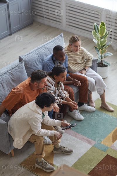 Молодые люди смотрят телевизор на диване