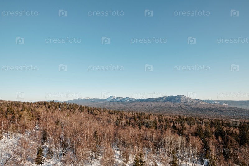 Пейзаж пейзажа с голубым небом, горами и лесом