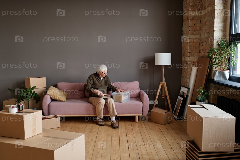Горизонтальный длинный снимок современного старшего человека, сидящего на диване в гостиной, распаковывающего вещи и вывозящего книги из пластикового контейнера после переезда в новый дом