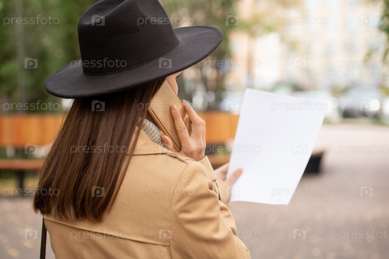 Задний вид элегантной деловой женщины, которая смотрит на бумагу и разговаривает по мобильному телефону