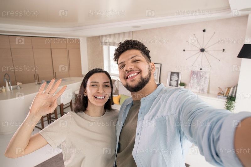 Молодая веселая пара в повседневной одежде смотрит на вас с зубчатой улыбкой, делая селфи дома