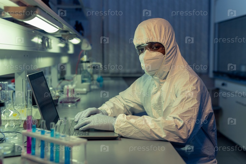 Африканский ученый-мужчина в комбинезонах, использующий ноутбук