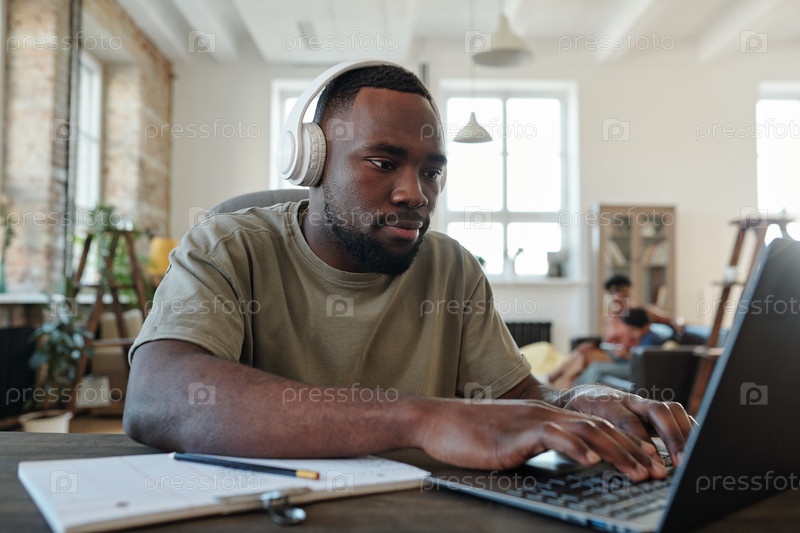 Молодой креативный дизайнер в наушниках нажимает кнопки ноутбука, работая над новым онлайн-проектом
