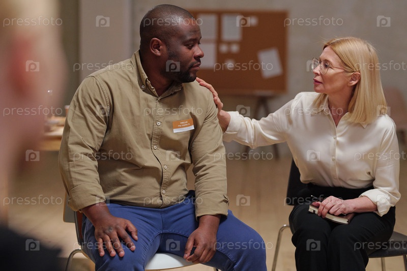 Зрелая блондинка утешает одного из пациентов во время сеанса