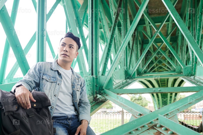 Азиатский путешественник под зеленым мостом