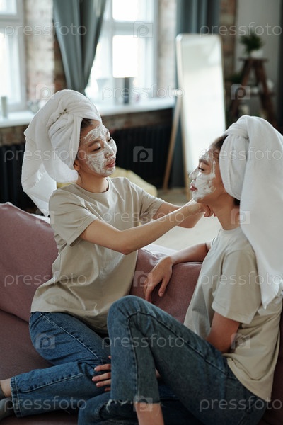 Милые женские близнецы с полотенцами на голове и глиняной маской для лица расслабляются после ванны