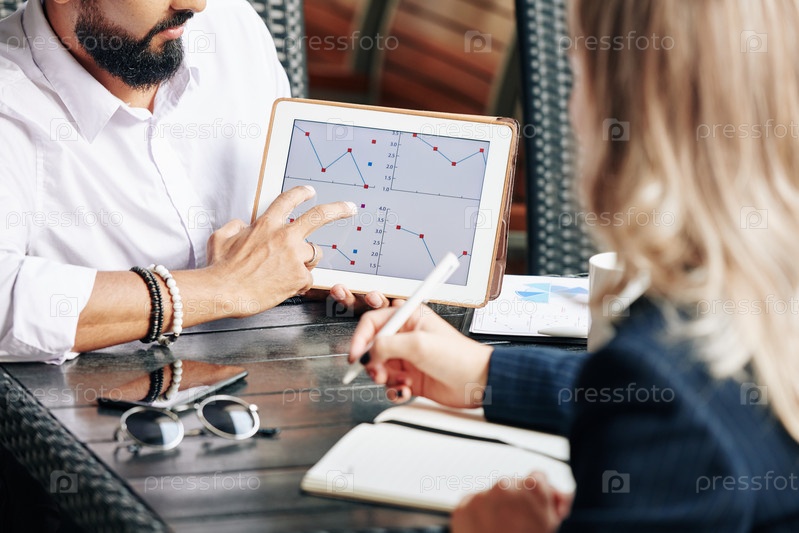 Бизнесмен показывает коллеге линейный график