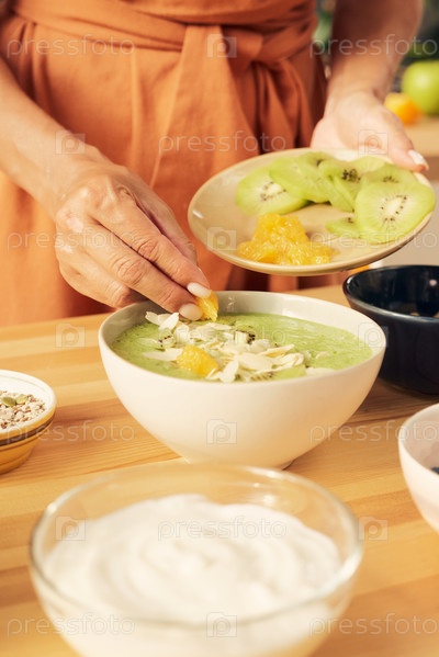 Молодая женщина украшает овощный смузи с кусочками киви