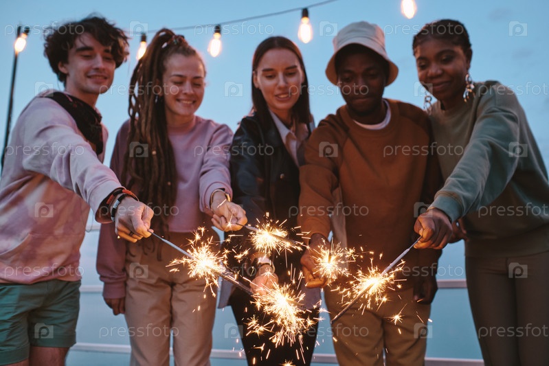Группа молодых друзей, держащих сверкающие бенгальские огни