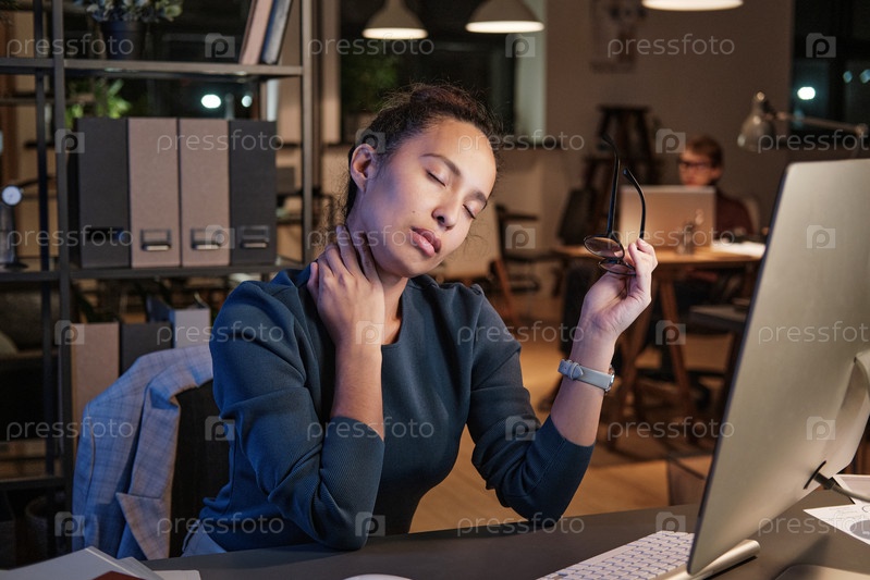 Усталая молодая женщина смешанной расы с закрытыми глазами, сидящая за столом со своими очками и прикасающаяся к шее в то время как она чувствует ее боль, работает по поздней концепции