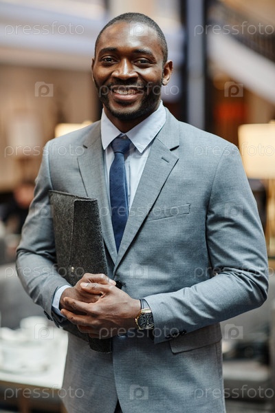 Улыбающийся бизнесмен позирует в вестибюле