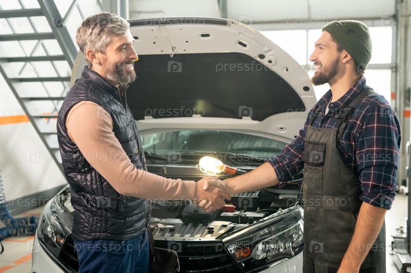 Счастливый профессиональный техник или работник автосервиса, пожавший руку клиенту