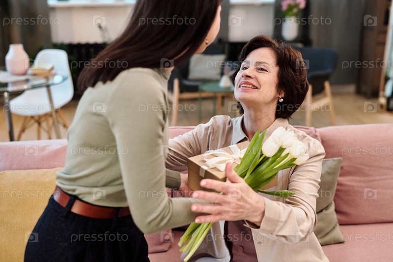 Счастливая зрелая брюнетка смотрит на свою дочь, получая подарки и тюльпаны