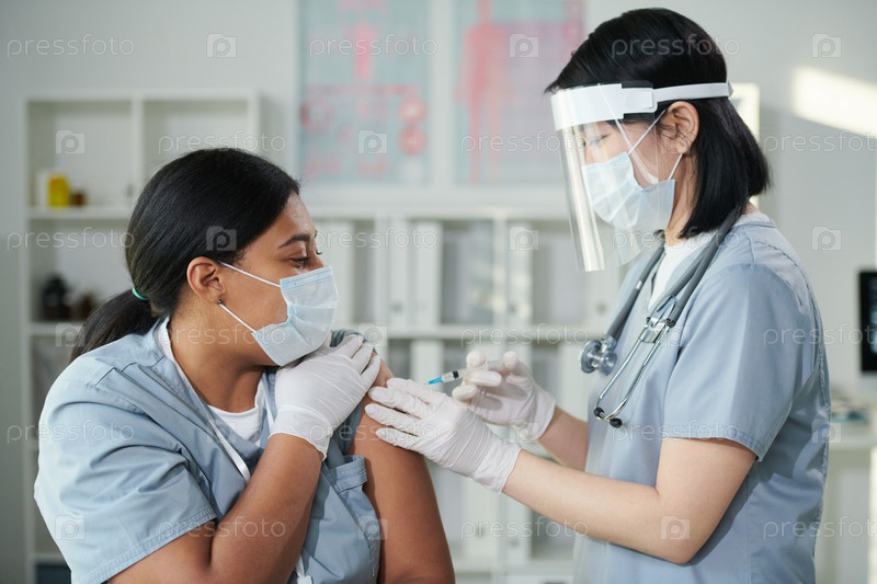 Молодая азиатская медсестра в защитной рабочей одежде прививает свою коллегу смешанной расы