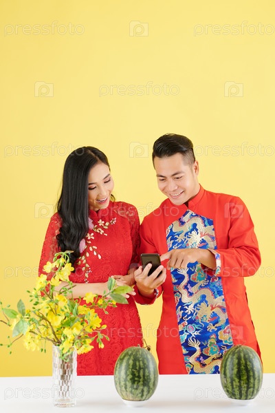 Пара, отправляющая сообщения друзьям на лунный Новый год