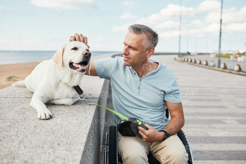Улыбающийся мужчина в инвалидном кресле Гуляющая собака