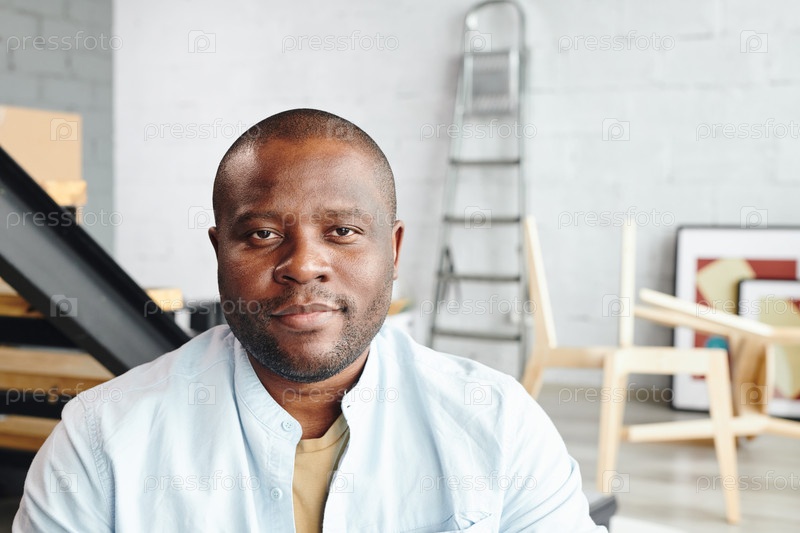 Молодой африканский мужчина смотрит на вас, стоя у лестницы с новой мебелью и ступенчатой лестницей