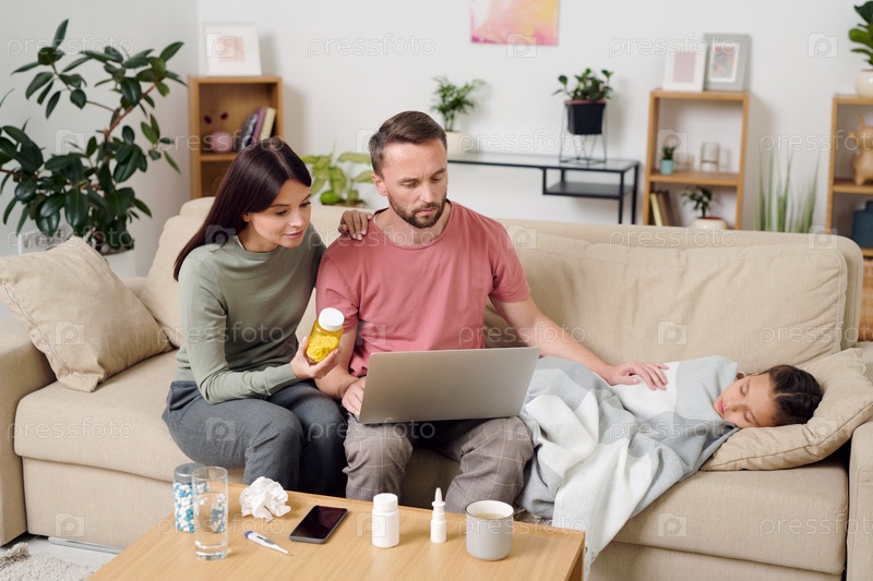 Молодая пара сидит на диване рядом со своей больной дочерью перед ноутбуком дома