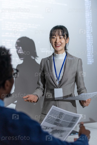 Счастливая молодая азиатская женщина с документами стоит у интерактивной доски с данными