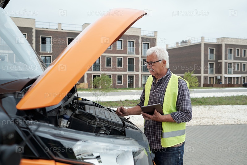 Старший водитель автобуса смотрит на двигатель, проверяя его