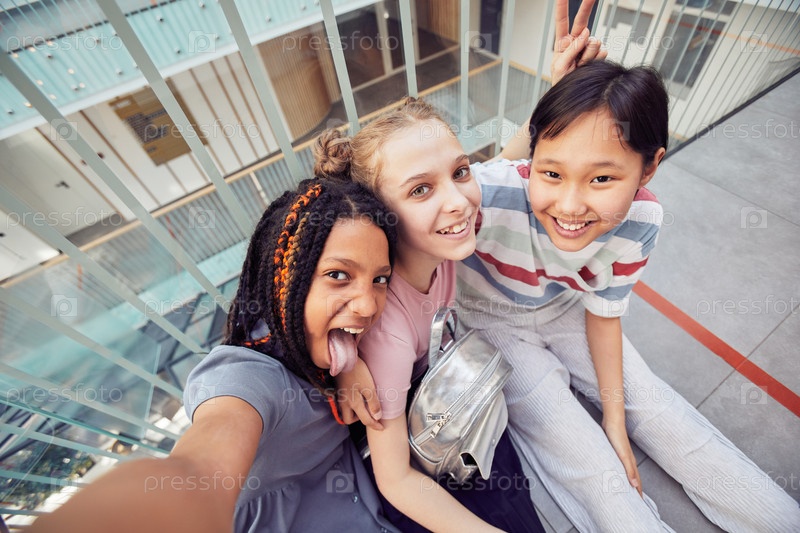 Молодые девочки делают селфи в школе