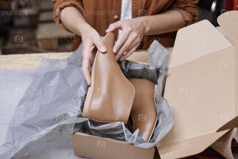Женщина упаковывает новые туфли в коробку