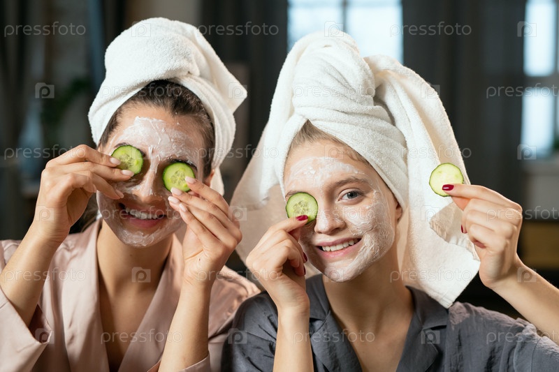 Молодые женщины с глиняными масками на лицах веселятся и наслаждаются процедурой красоты