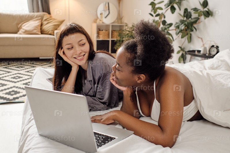 Две счастливые подруги, лежащие в постели перед ноутбуком