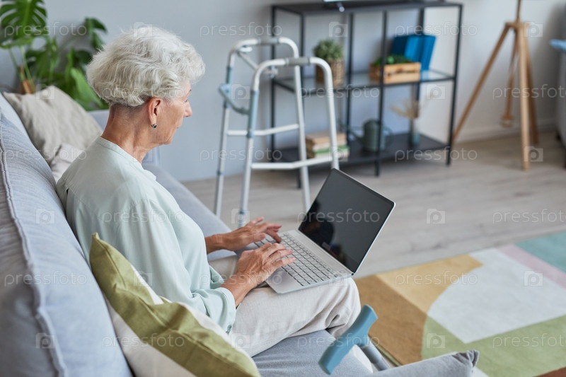 Пожилая женщина, использующая ноутбук дома