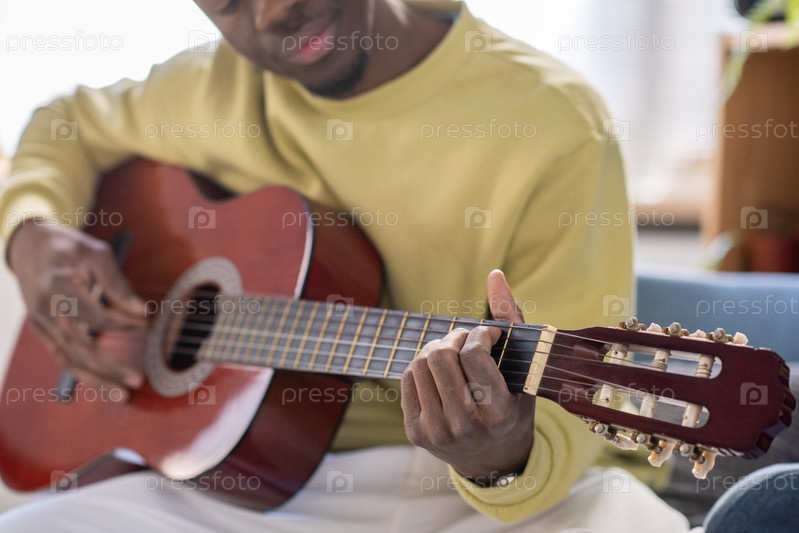 Руки молодого африканца, играющего на гитаре перед камерой