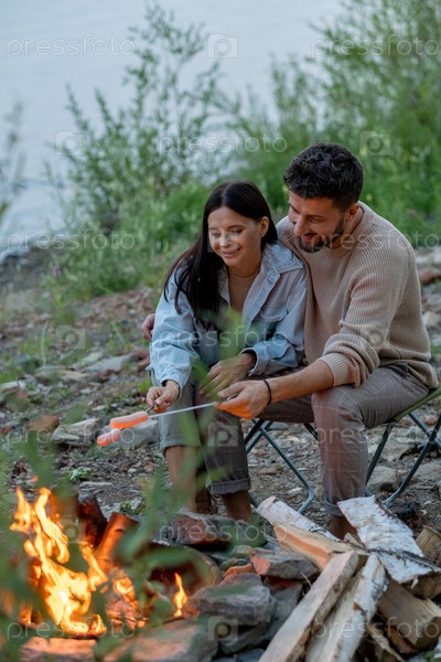 Счастливая молодая пара проводит время у костра