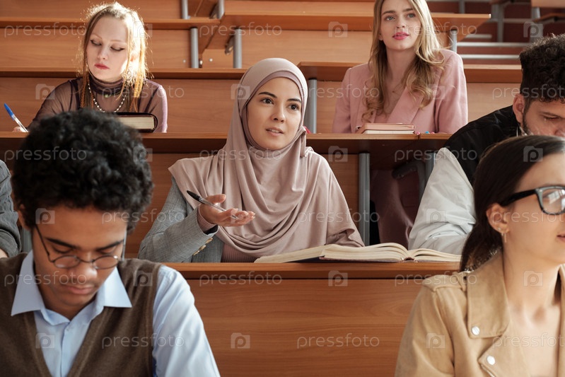 Студентка в хиджабе объясняет свое мнение учителю