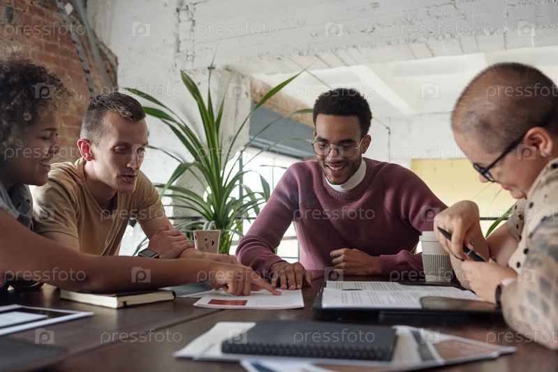 Счастливый молодой человек смотрит на бумагу, в то время как один из его коллег указывает на нее