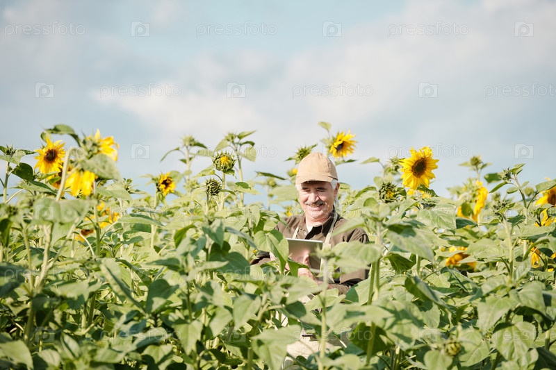 Веселый фермер-мужчина стоит на поле подсолнечника и использует сенсорную панель во время работы