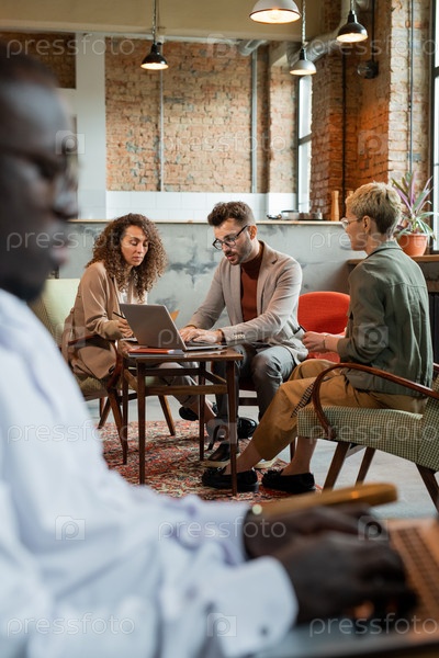 Молодой бизнесмен вычисляет за столом среди двух коллег-женщин