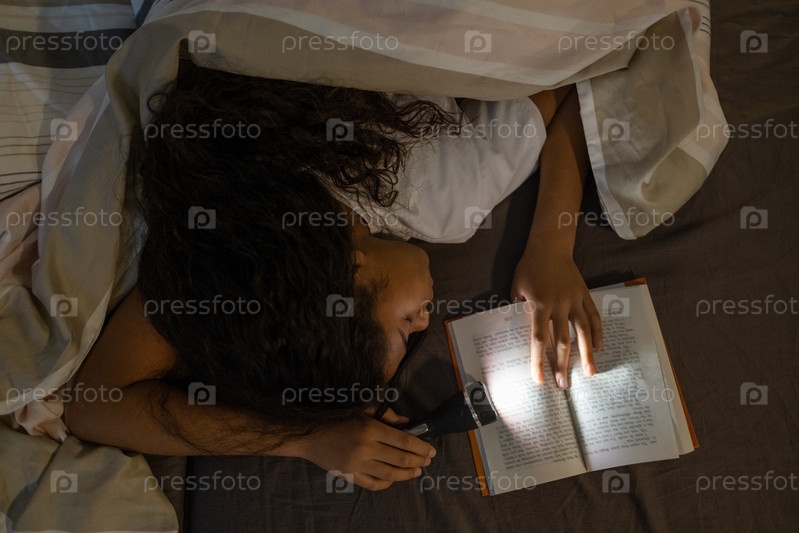 Афроамериканская девушка спит с фонариком в постели