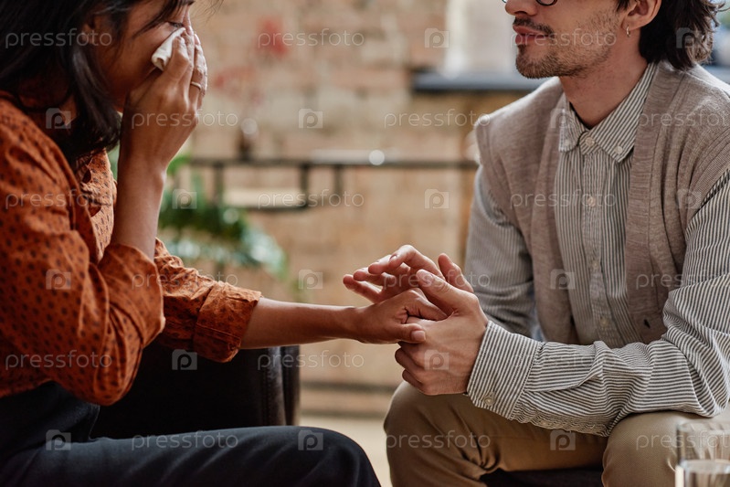 Горизонтальный снимок молодого человека, работающего профессиональным психологом и утешающего плачущую женщину во время сеанса, держащей ее за руку