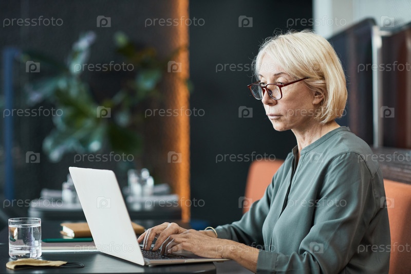 Концентрированная фриланс-старшая женщина, использующая ноутбук в кафе