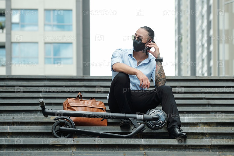 Мужчина в защитной маске звонит по телефону