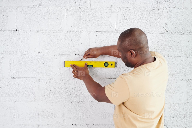 Молодой африканский мужчина с карандашом рисует линию над уровнем измерительного инструмента на белой окрашенной кирпичной стене