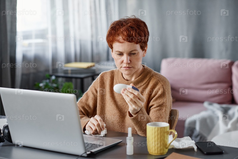 Портрет взрослой женщины с гриппом, сидящей за столом дома перед ноутбуком и проверяющей температуру тела с помощью термометра