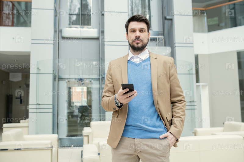 Бородатый адвокат проверяет смартфон в вестибюле