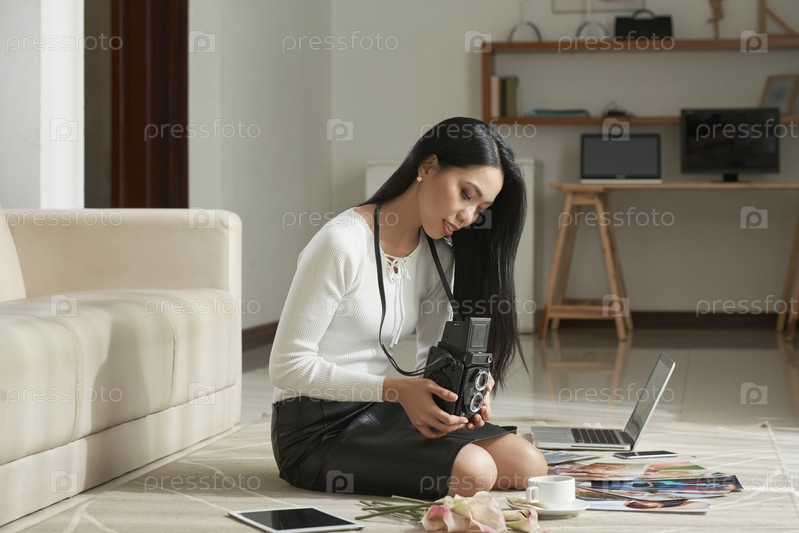 Красивая девушка, глядящая на цифровые фотографии
