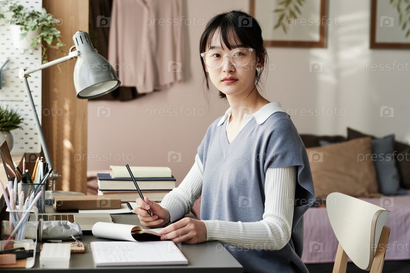 Портрет умной азиатской девушки в очках, сидящей за столом и записывающейся на скетчепаде в комнате кампуса