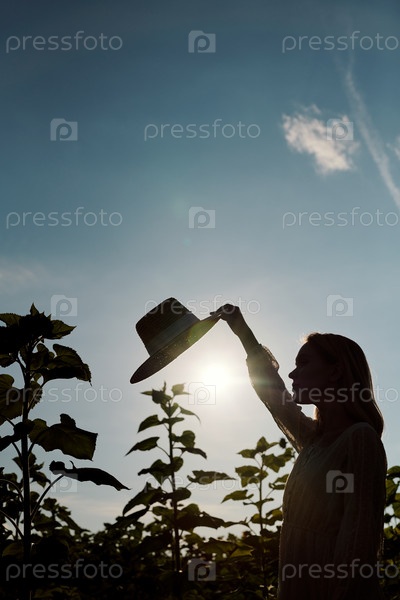Силуэт молодой женщины, стоящей перед камерой среди подсолнечников