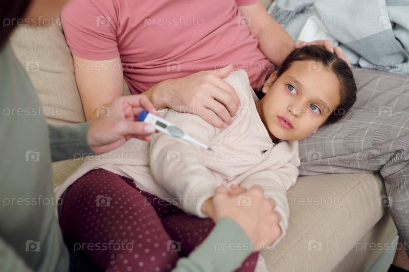 Рука осторожного молодого человека, заботящегося о больной милой дочери, лежащей на диване