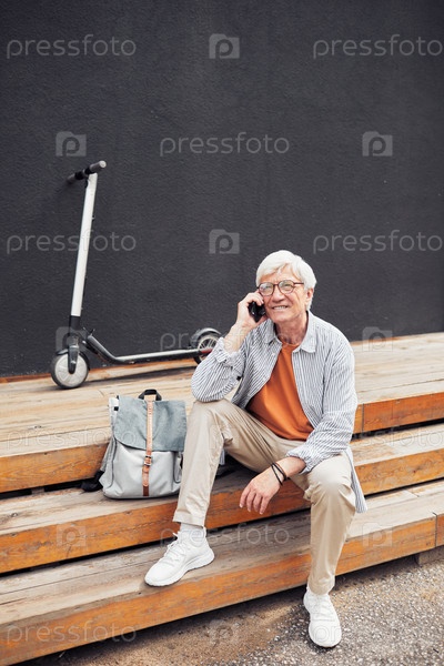 Пожилой мужчина говорит со смартфона в активном городе